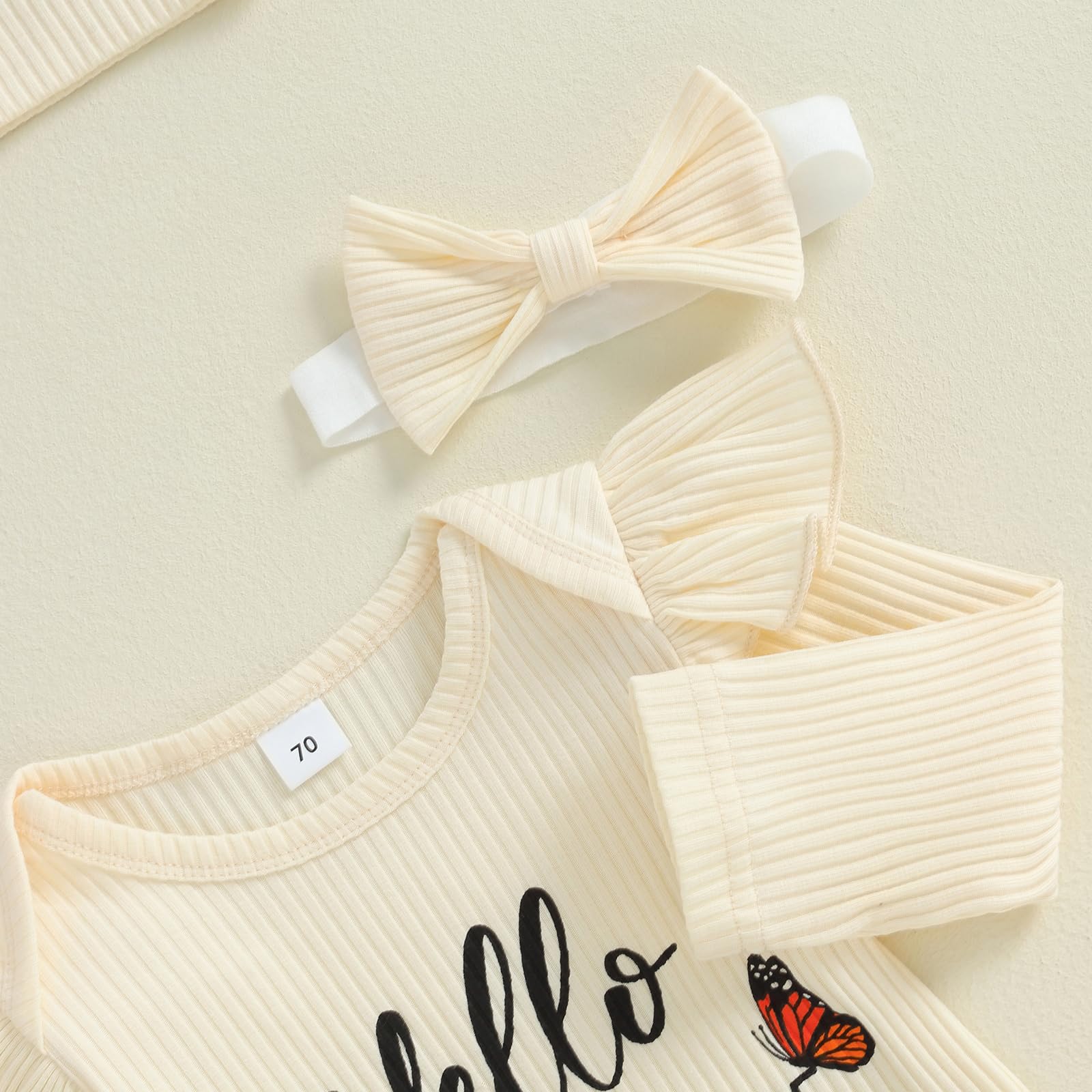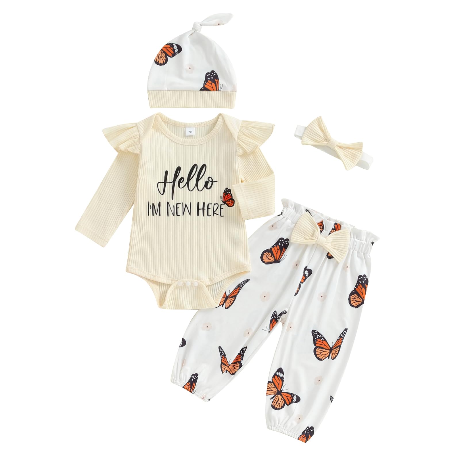 - Design: Cute baby girls fall clothes, features with crew neck long flying sleeve lettered romper. Button closure, hello, i’m new here, letter print ribbed romper top, matching the elastic bow waist bow pattern / butterfly print leggings pants, lovely hat and headband, This 4 pieces infant girls coming home clothes set, make your little one more adorable.