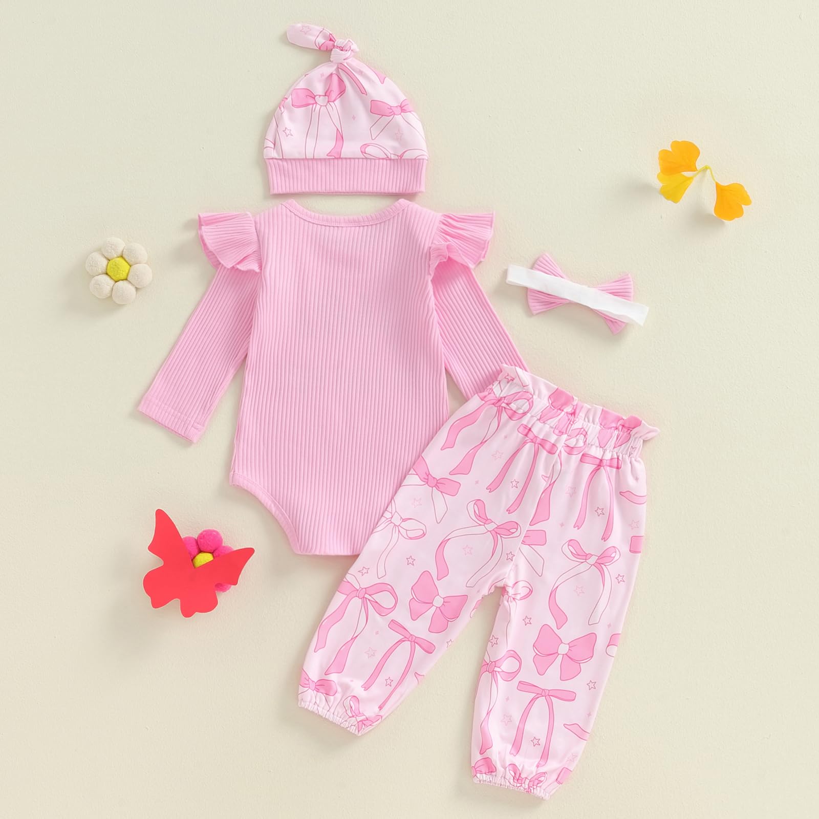 Newborn Come Home Outfits Baby Girls 4pcs Outfits Set Long Sleeve Romper Top Bow Print Trousers Hat Headband Set Infant Fall Clothes
